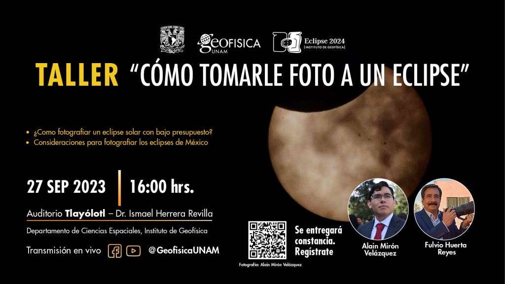 Falta una semana para el increíble taller que estamos organizando en el Departamento de Ciencias Espaciales, Instituto de Geofísica, UNAM. Será compartido por dos ponentes con experiencia en fotografía de eclipses solares. Pueden vsitarnos en persona o conectarse a través de nuestras redes sociales o por Zoom. ¡Se entregarán constancias de participación!