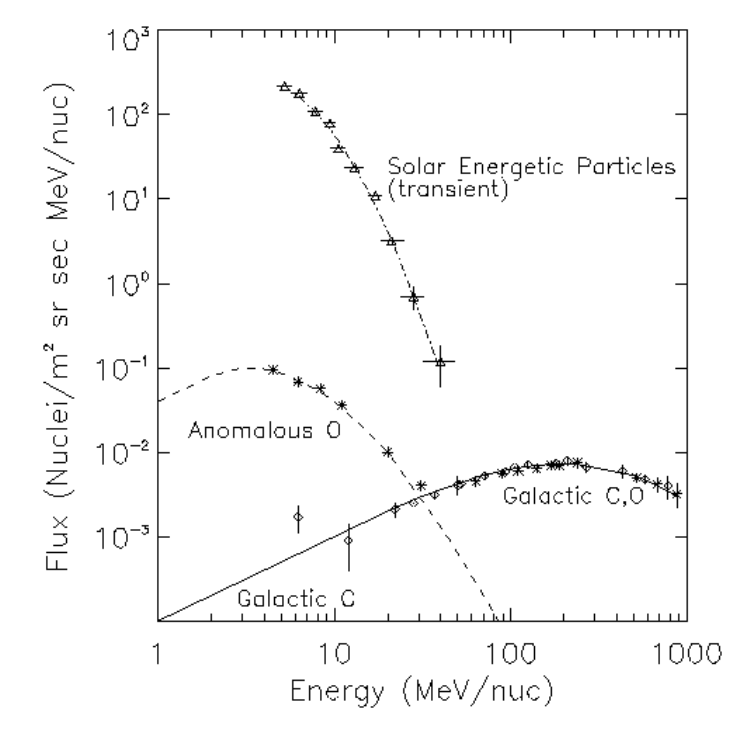 Luego están los rayos cósmicos anómalos con energías entre 107 y 108 eV. Los científicos creen que la fuente de estas partículas son iones neutros provenientes del espacio interestelar que ingresan al Sistema Solar. Cuando se acercan lo suficiente al Sol, los rayos X y la luz ultravioleta extrema del Sol los ionizan. Luego, el viento solar las lleva hasta el mismo borde de la heliosfera, donde estas partículas se aceleran a altas energías. Algunas pueden entonces volver en el mismo centro del Sistema Solar.