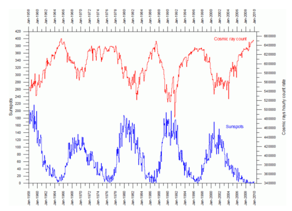 Figura 2: Anticorrelación entre el flujo de partículas cósmicas galácticas (curva roja) y el número de manchas solares (curva azul). Las manchas solares son un indicador fiable de la actividad solar. Durante el máximo solar, su número aumenta considerablemente. Fuente: [9].