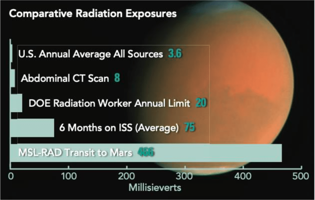 En el pasado, los científicos instalaron un dispositivo llamado Radiation Assessment Detector (RAD, ver también la Figura 3) en el rover Curiosity para medir la dosis de radiación que recibirían los humanos en el camino a Marte. Descubrieron que si el viaje de ida y vuelta a Marte tomara solo un año, los astronautas recibirían una dosis equivalente a 662 miliSv. Según las normas de la NASA, los astronautas no deben recibir una dosis superior a 1000 miliSv durante toda su carrera. Zeitlin y los colaboradores llegaron a conclusiones similares respecto a la dosis de radiación durante el viaje a Marte, que sería de 0.66 ± 0,12 Sv.