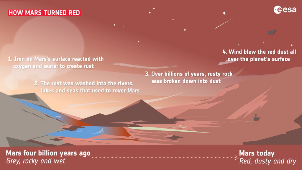 El agua y el oxígeno libre estuvieron presentes en Marte hace más de 3.000 millones de años. Ahora, los científicos intentan determinar si el misterioso óxido de hierro se formó simultáneamente en todo el planeta o si apareció en regiones específicas y, con el paso de miles de millones de años, el viento lo dispersó por toda la superficie del Planeta Rojo.