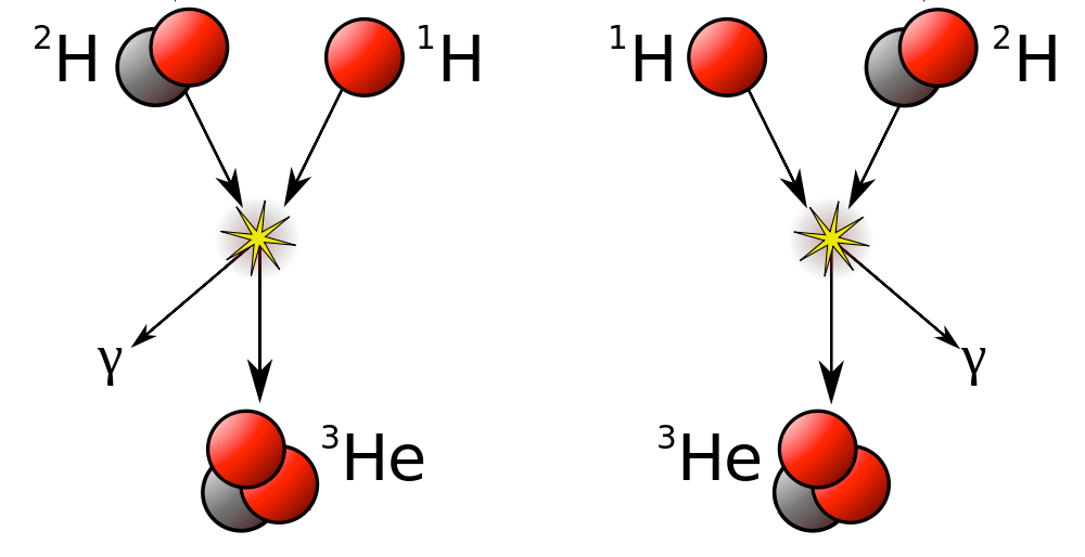 Para la segunda reacción se requiere una colisión entre un núcleo de deuterio y otro protón, formándose así un núcleo de helio-3, compuesto por un neutrón y dos protones. Es durante esta reacción que el hidrógeno se transforma en helio.
