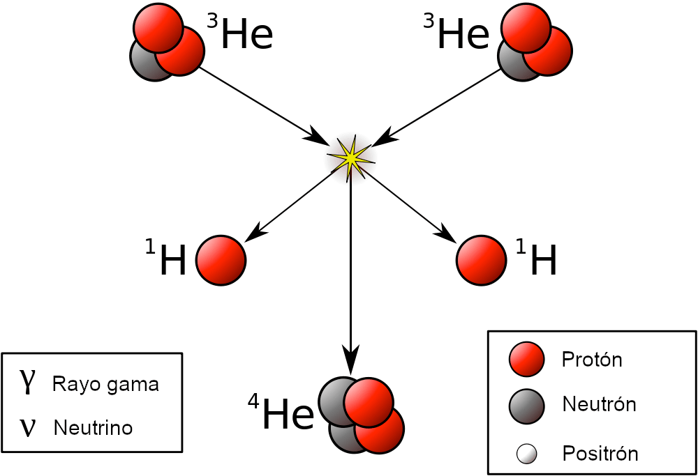 La tercera reacción ocurre cuando chocan dos núcleos de helio-3, produciendo un núcleo de helio-4, compuesto por dos protones y dos neutrones, y liberando además dos protones.