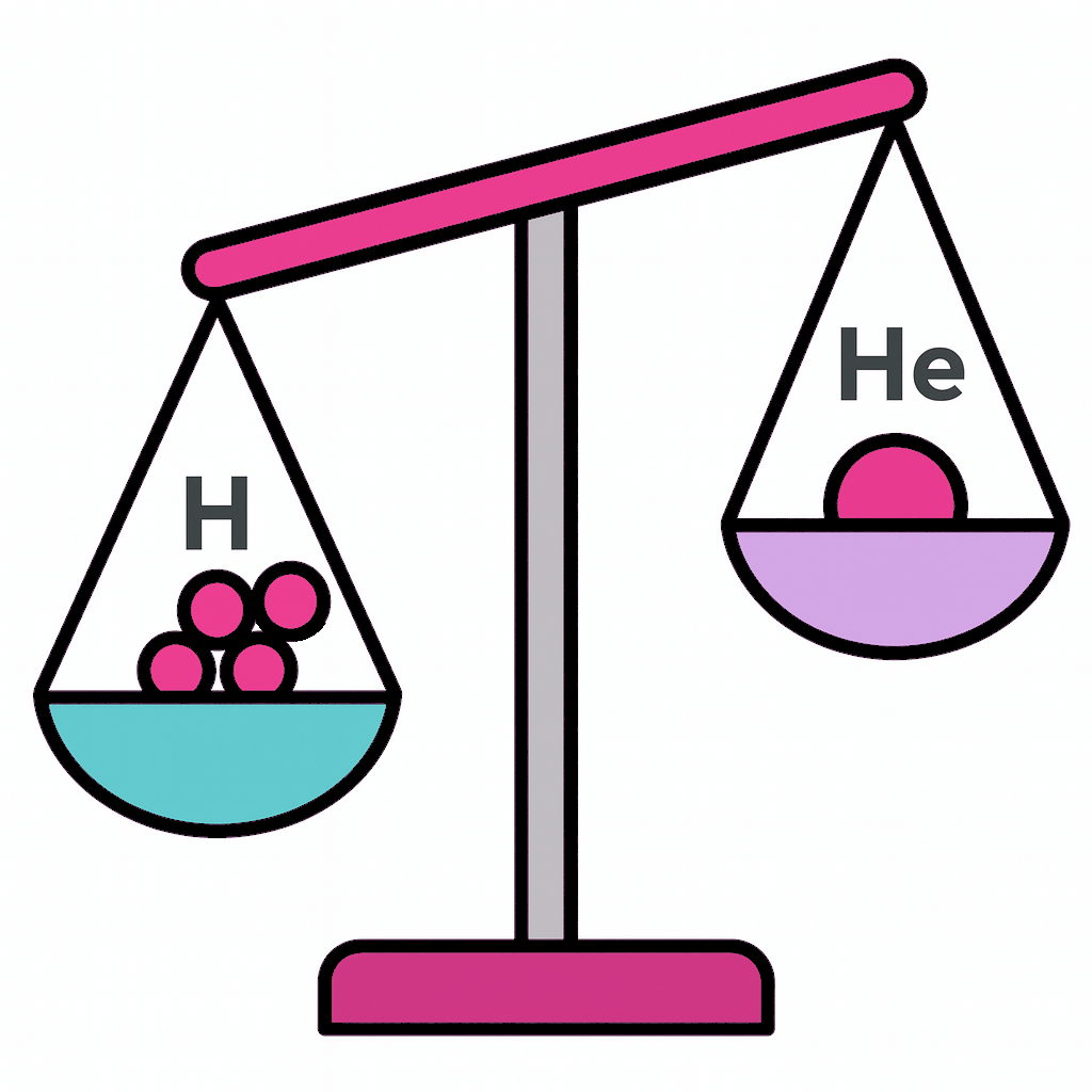 Tomando en cuenta únicamente las partículas iniciales y el resultado final, vemos que el núcleo de helio-4 se forma a partir de cuatro protones. Sin embargo, la masa de cuatro protones es ligeramente mayor que la masa del núcleo de helio. La razón es que los neutrones son un poco más ligeros que los protones. ¿A dónde fue a parar la masa faltante? La respuesta está en los productos secundarios de las reacciones nucleares. Entre ellos se encuentran dos positrones, cuya masa es igual a la de los electrones, dos neutrinos y dos fotones. Aproximadamente el 0,7 % de la masa de los protones se convierte en energía cinética de estas partículas y en radiación electromagnética. Para que el Sol irradie con una potencia de 1026 vatios, deben fusionarse cada segundo nada menos que 1038 protones. Suena enorme, pero el Sol es un cuerpo colosal, compuesto por 1057 protones, de los cuales alrededor del 10 % se encuentra en el núcleo solar. La fusión de 1038 protones por segundo es suficiente para que nuestra estrella brille de forma continua durante unos 1019 segundos, es decir, 10 mil millones de años.