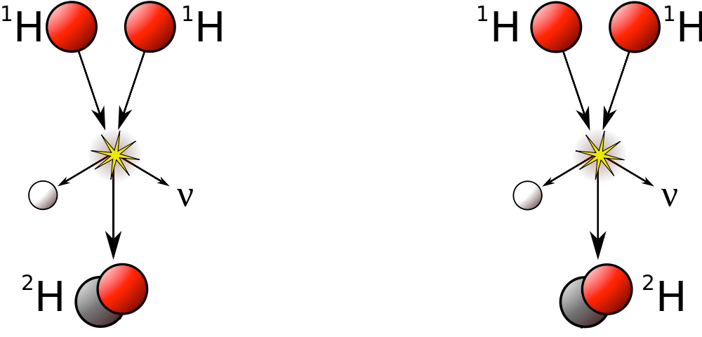 Esto lo logra gracias a las reacciones nucleares en su interior. Para convertir el hidrógeno en el hélio se necesita una secuencia de tres reacciones nucleares conocida como ciclo protón-protón, o ciclo pp. Para la primera reacción se necesitan protones rápidos. La temperatura extremadamente alta en el núcleo solar significa que los protones allí tienen una velocidad típica de unos 350 kilómetros por segundo. La colisión de dos protones puede llevar a su fusión, durante la cual uno de ellos se transforma en un neutrón. Ambas partículas, el protón y el neutrón, se unen formando una nueva versión más pesada del hidrógeno, llamada deuterio.