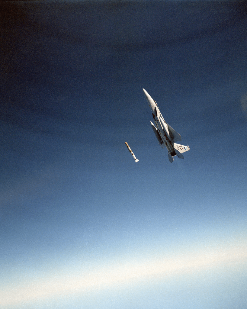 Un avión F-15 Eagle lanzando un misil antisatélite durante una prueba. Fuente: Wikipedia.