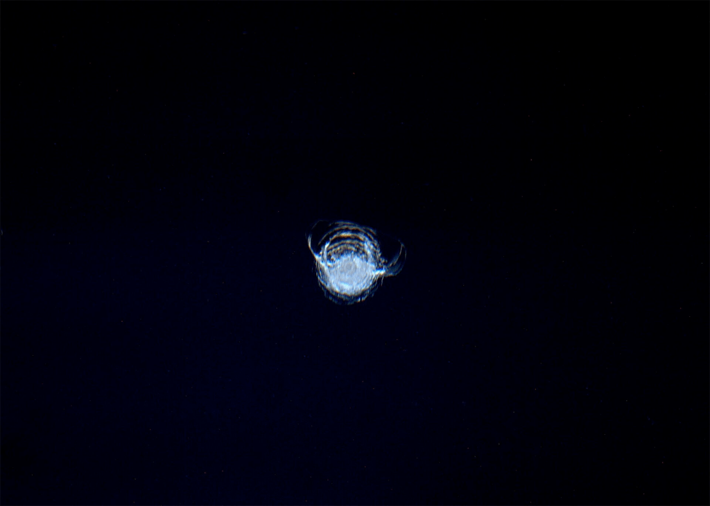 Daño en una de las ventanas de la Estación Espacial Internacional de 7 mm de diámetro causado por el impacto de un diminuto fragmento de basura espacial, posiblemente una escama de pintura o un pequeño fragmento metálico con un espesor no mayor que unas milésimas de milímetro. Fuente: Agencia Espacial Europea.
