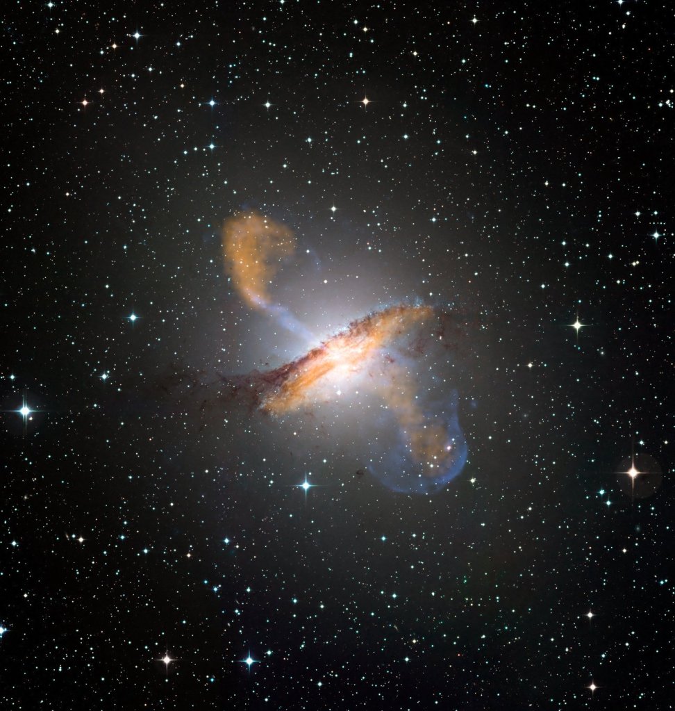 Imagen compuesta del Centauro A, una galaxia a 12 millones de años luz ubicada en la constelación de Centauro con dos chorros emitidos por un agujero negro supermasivo en el centro de la galaxia.