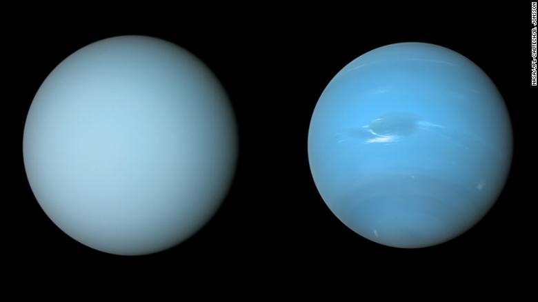 Cuando la sonda Voyager 2 tomó las primeras imágenes cercanas de ambos planetas en la década de 1980, los astrónomos descubrieron que la atmósfera de Neptuno es mucho más activa que la de Urano. Los aerosoles, es decir, las suspensiones de partículas sólidas en la atmósfera, forman nubes blancas en la capa de la atmósfera de Neptuno, que llamamos la troposfera. La sonda Voyager 2 también fotografió la llamada Gran Mancha Oscura en Neptuno. Esta fue una gran tormenta, con una superficie de 13.000 km × 6.600 km. Se trataba de un anticiclón gigante, similar a la Gran Mancha Roja de Júpiter. Pero si este último ha existido en Júpiter desde hace 400 años, la gran mancha oscura ya no volvió a aparecer en las fotos de Neptuno tomadas por el Telescopio Espacial Hubble unos pocos años después.