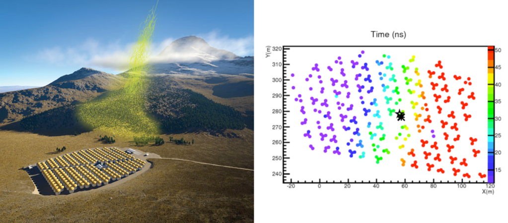 Figura 2. Izquierda: Una lluvia de partículas cósmicas atmosféricas sobre HAWC. Fuente: Universidad de Rochester. Derecha: Secuencia temporal en la que los diferentes detectores del observatorio HAWC detectaron un único evento. Fuente: HAWC.