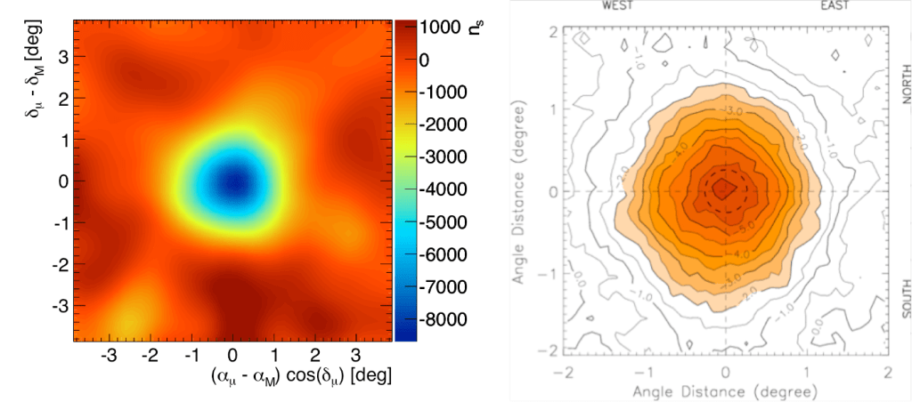 Figura 3. Izquierda: Sombra de la Luna. Fuente: Observatorio de neutrinos IceCube. Derecha: la sombra del Sol. Fuente: Instituto para la Investigación de Rayos Cósmicos, Universidad de Tokio. Tomada con el observatorio Tibet Air Shower Array.