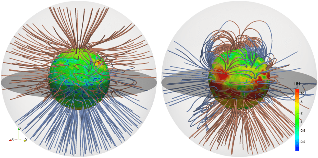 Figura 4: Un ejemplo del campo magnético solar durante el mínimo solar en diciembre de 2008 (izquierda) y el máximo en diciembre de 2014 (derecha). Fuente: Becker Tjus et al. (2019)