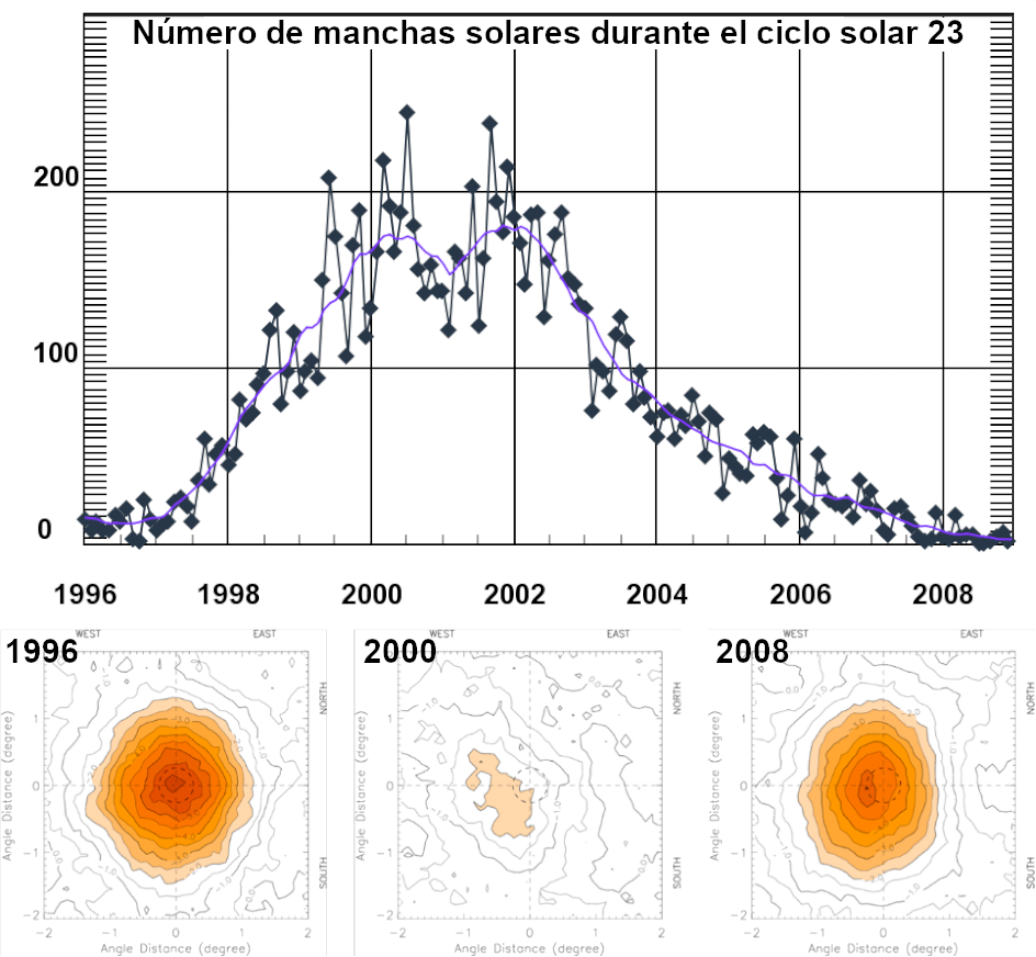 Figura 5. Arriba: Número de manchas solares durante el Ciclo Solar 23. Fuente: Centro de Predicción del Clima Espacial de la NOAA. Abajo: La sombra del Sol en 1996 (mínimo solar), 2000 (máximo) y 2008 (mínimo). Fuente: Tibet Air Shower Array.