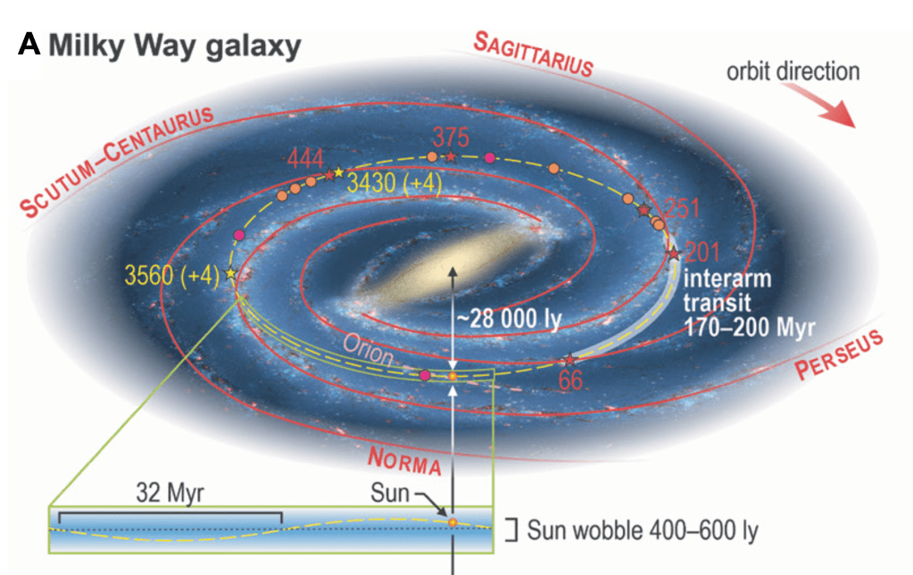 Nuestra Galaxia es un disco enorme que contiene alrededor de 100 mil millones de estrellas. Su diámetro mide unos 100,000 años luz, mientras que el grosor de este disco es diez veces menor. La Vía Láctea pertenece a las llamadas galaxias espirales barradas. Los brazos espirales son regiones de las galaxias con una mayor densidad de estrellas y nubes de gas interestelar. Aunque todavía no se ha llegado a un consenso definitivo sobre la estructura exacta de la Vía Láctea, los científicos están de acuerdo en que cuatro brazos espirales se extienden desde su centro. Cada uno de ellos tiene su nombre que obtuvo según las constelaciones en las que aparentemente se encuentra. Así, tenemos el brazo de Perseo, Sagitario, Norma y Escudo-Centauro. Nosotros estamos ubicados dentro del brazo de Orión-Cisney, que forma parte del brazo de Norma. Estos brazos orbitan nuestra Galaxia a velocidades de alrededor de 210 km/s y al mismo tiempo se propagan desde su centro hacia afuera. Su velocidad orbital es unos 30 km/s menor que la velocidad con la que el Sol orbita el centro de la Vía Láctea. Y así llegamos al ya mencionado período de 200 millones de años. Es decir, el Sol es mas rápido que los brazos espirales por lo que se tarda entre 170 a 200 millones de años de dejar atrás un brazo y alcanzar al siguiente.