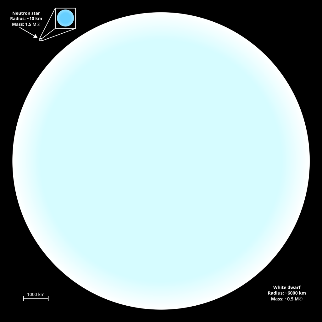 Comparación de tamaños de una estrella de neutrones y una enana blanca. El tamaño de la última es parecido a la de la Tierra. Fuente: Wikipedia.