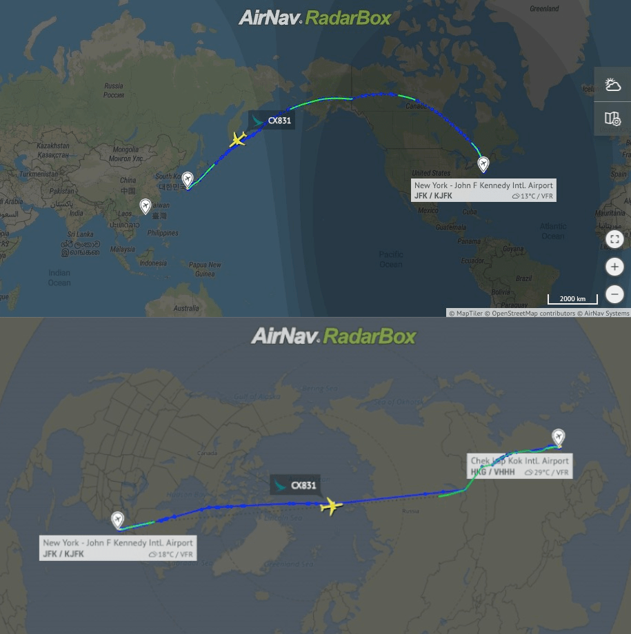 Arriba: ruta del vuelo transpolar CX831 el día 9 de octubre del 2024. Abajo: rurta normal del mismo vuelo.