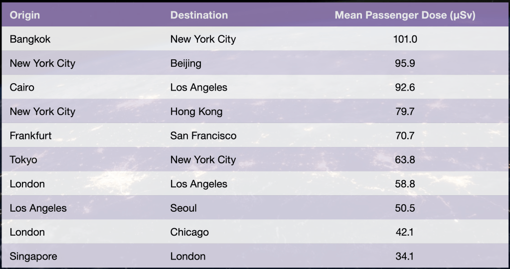 Durante los vuelos de larga duración, las dosis habituales son del orden de decenas de μSv. En los vuelos transpolares estas dosis aumenta significativamente, ya que a lo largo del año, las tripulaciones en estos vuelos pueden llegar a acumular hasta 6 mSv.
