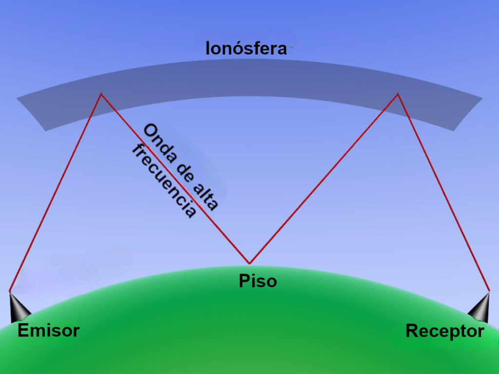 Propagación de las ondas de radio de frecuencia alta (HF). Fuente: Wikipedia.