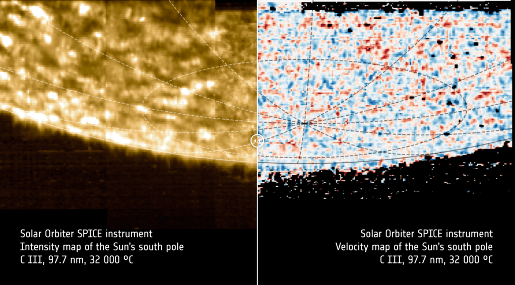 Adicionalmente, SPICE logró un nuevo hito en la medición solar. Por primera vez, midiendo desplazamientos Doppler en líneas espectrales de elementos como hidrógeno, carbono, oxígeno, neón y magnesio, los científicos pudieron determinar la velocidad del plasma en distintas capas de la atmósfera solar en las regiones polares. Esto permitió construir un mapa de velocidades, esencial para comprender la dinámica interna del Sol.